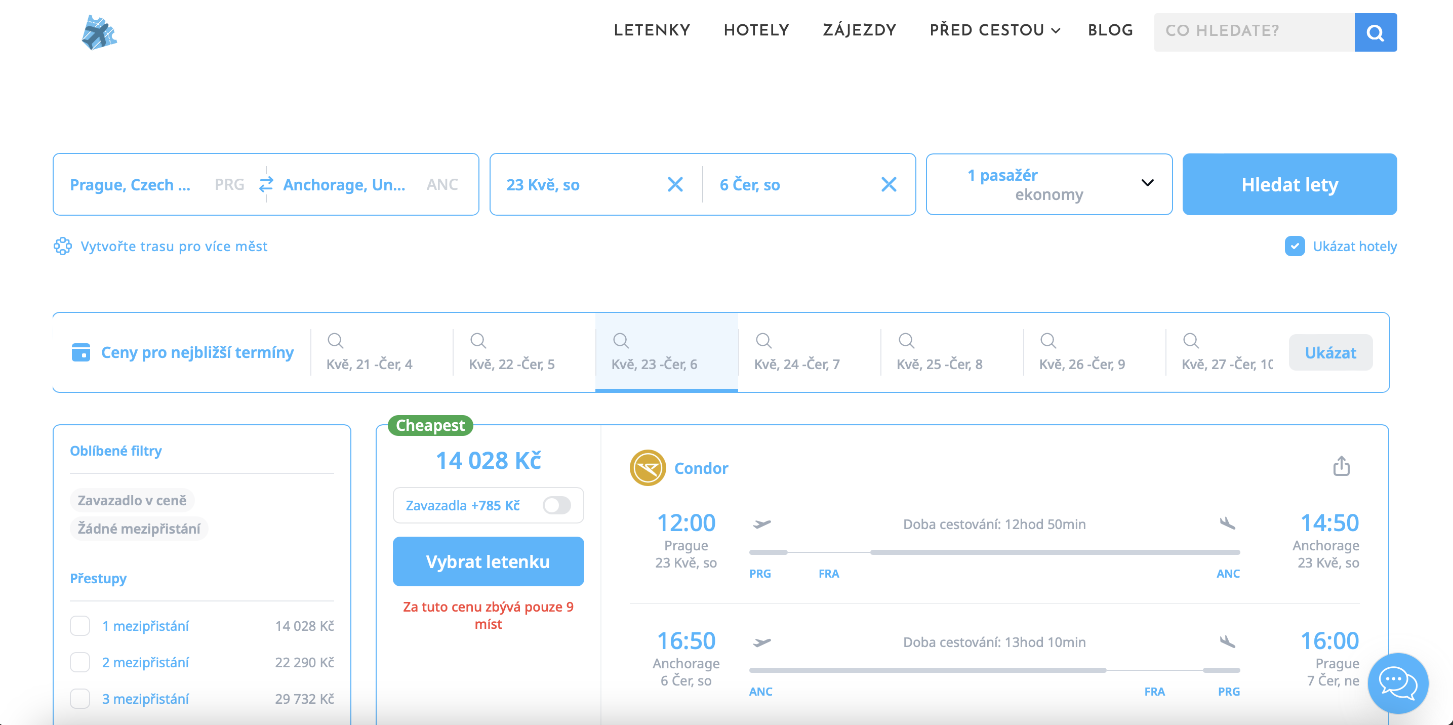 Tahle nabídka patří mezi ty opravdu zajímavé! Zpáteční letenky z Prahy do Anchorage na Aljašce pořídíš už za 14 028 Kč s jedním přestupem ve Frankfurtu na termíny s odletem v květnu. Běžně se přitom ceny na této trase pohybují zhruba mezi 25–28 tisíci Kč, takže aktuální akce znamená opravdu výraznou úsporu.