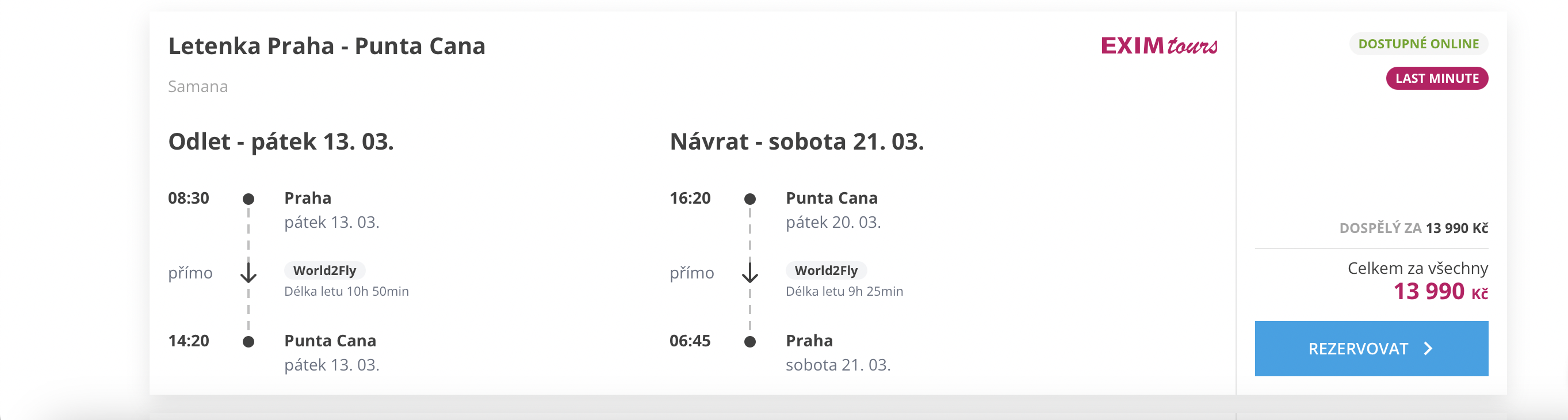 Skvělá last-minute akční nabídka pro milovníky tepla, pláží a karibské atmosféry! Zpáteční letenky z Prahy do Punta Cana pořídíte za 13 990 Kč s přímým letem – dostupné na týdenní či dvoutýdenní pobyt v březnu 2026. Tato akce je výrazně časově i kapacitně omezená a letenky lze rezervovat pouze přes stránku cestovní kanceláře EXIM tours, takže je dobré neotálet. Punta Cana patří k nejpopulárnějším destinacím Karibiku a nabízí kombinaci krásných pláží, teplého moře a pohodové dovolené.