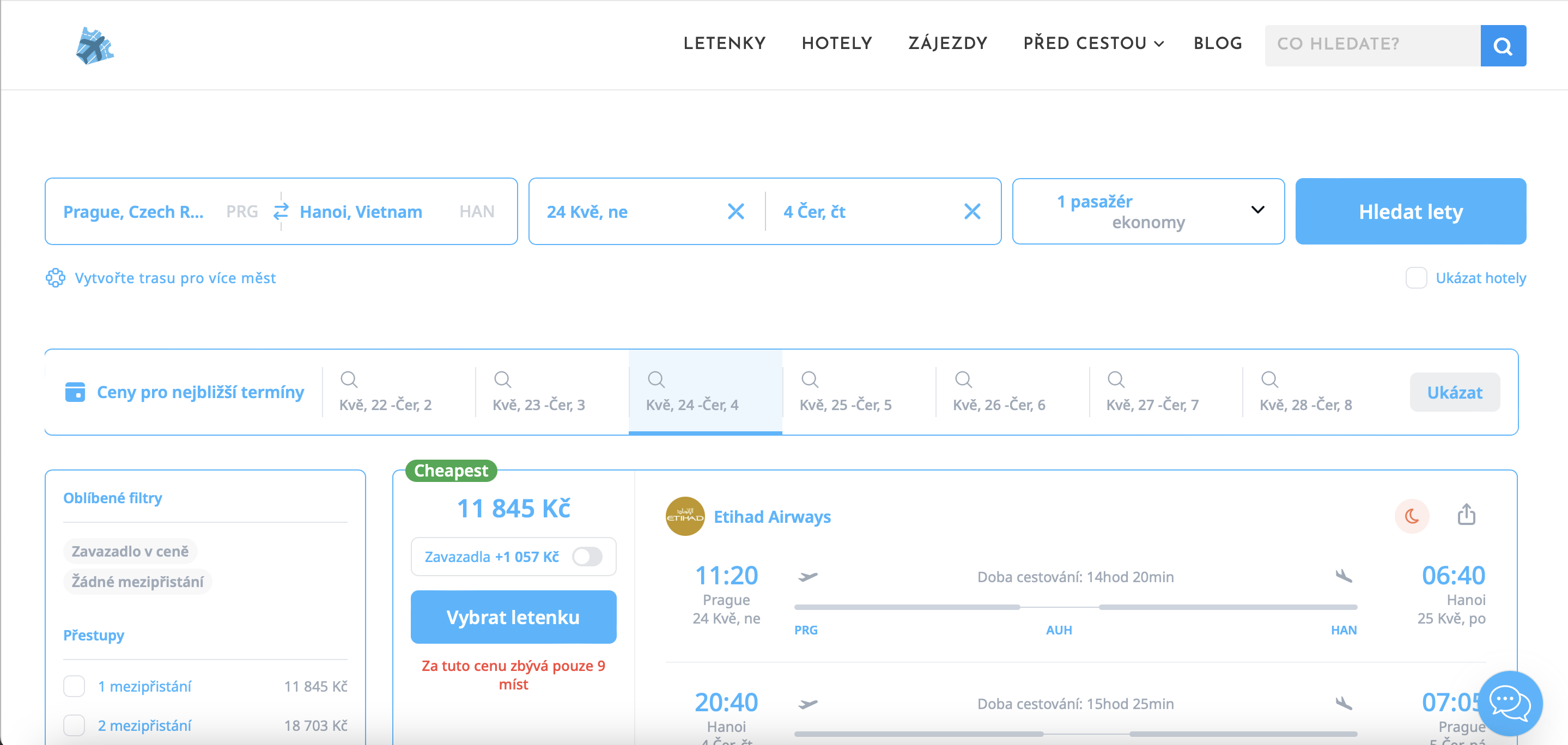 Velmi zajímavá akční nabídka do jihovýchodní Asie! Zpáteční letenky z Prahy do Hanoje pořídíš už za 11 845 Kč s aerolinkou Etihad Airways na termíny v květnu a červnu 2026. Na poměry této trasy jde o výrazně podprůměrnou cenu – běžně se letenky pohybují klidně kolem 16–20 tisíc Kč i více!