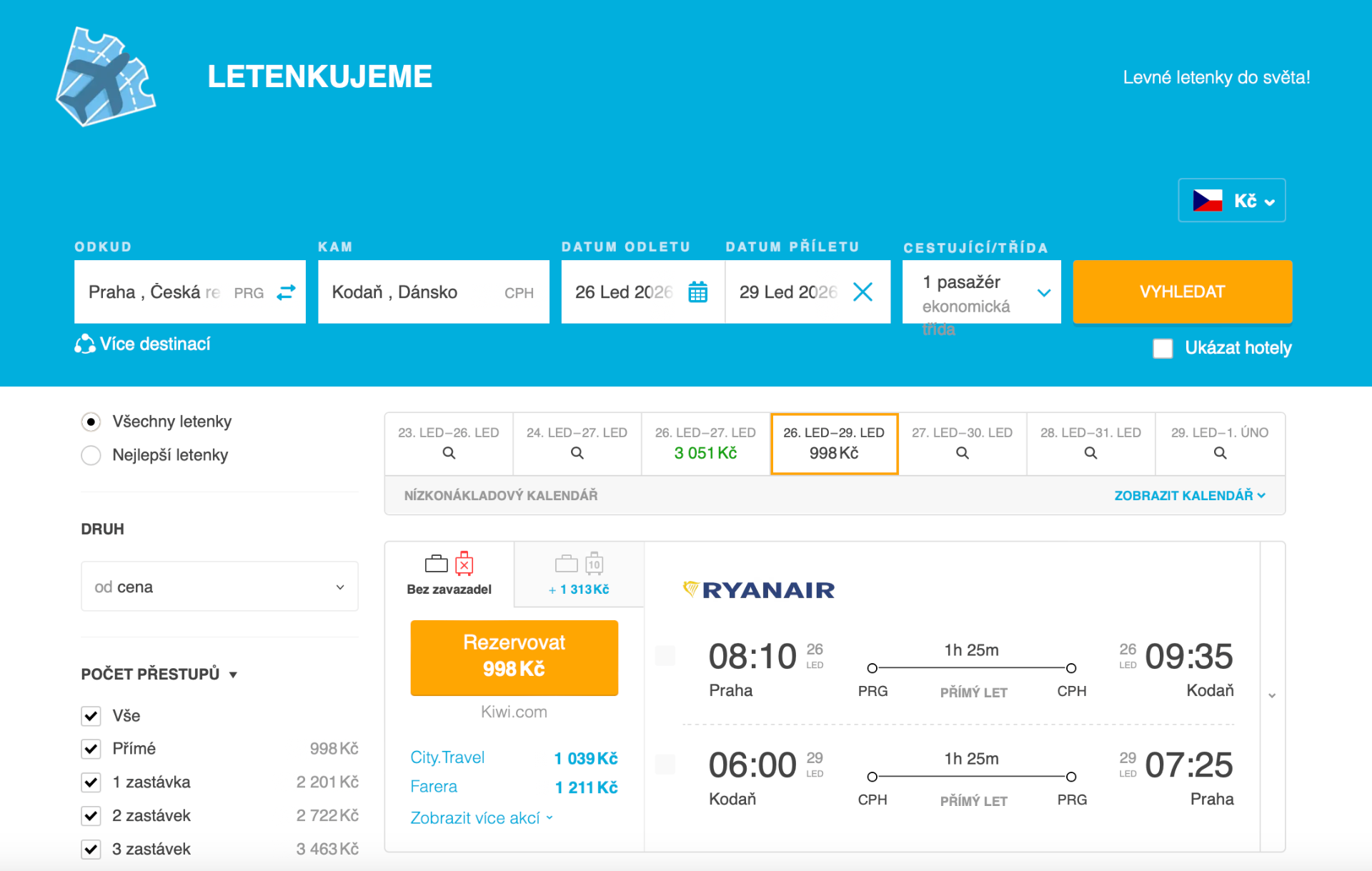 Skvělá nabídka pro zimní city break! Zpáteční akční letenky z Prahy do Kodaně seženete už za 998 Kč na termíny v lednu či únoru. Pro nejvýhodnější ceny doporučujeme hledat kombinace, kde je odlet i návrat v pondělí, čtvrtek nebo pátek (v únoru případně i sobotu) – ideální pro krátký pobyt u Severního moře.