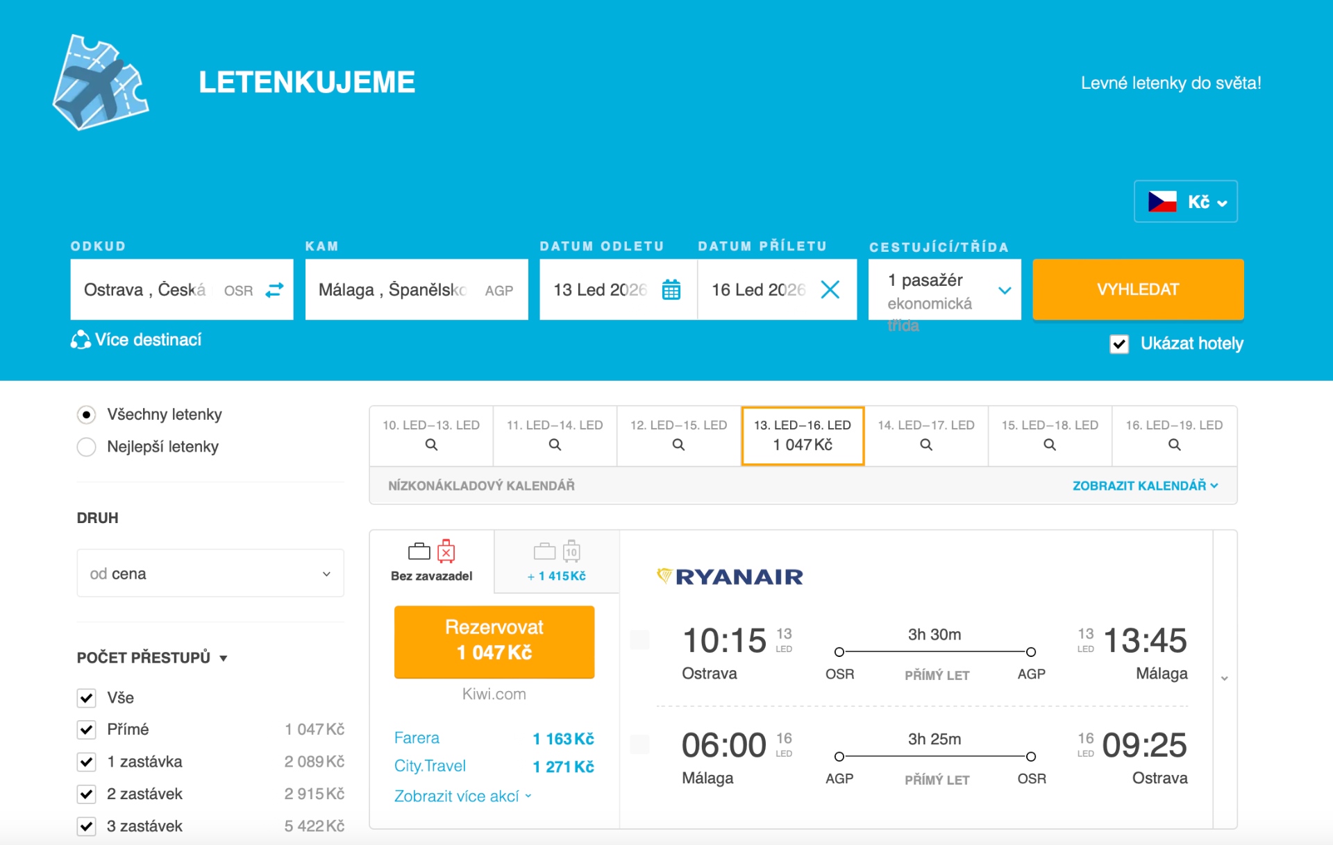 Skvělá nabídka pro zimní únik za sluncem! Akční zpáteční letenky z Ostravy do Málagy pořídíte už za 1 047 Kč na termín v lednu. Díky tomu, že je Málaga přímo na pobřeží Středozemního moře, si tady můžete užít příjemné teploty i během zimních měsíců – perfektní kontrast k šedivé zimě u nás.
