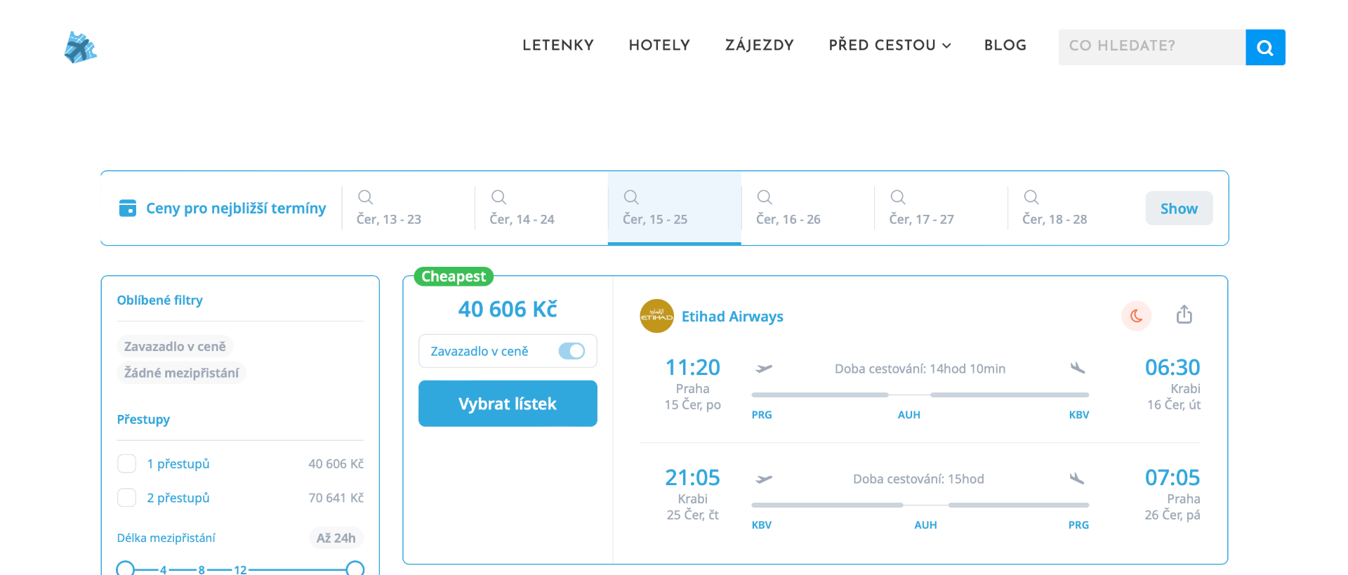 Výjimečná akční nabídka zažít dovolenou v luxusu! Zpáteční letenky v business class z Prahy do Krabi pořídíte už za 40 606 Kč s prémiovou aerolinkou Etihad Airways. K dispozici jsou termíny v květnu (např. 4. - 19. května) a červnu (např. 15. - 25. června), ideální pro letní únik do teplého Thajska s vyšší úrovní komfortu, pohodlí a servisu.
