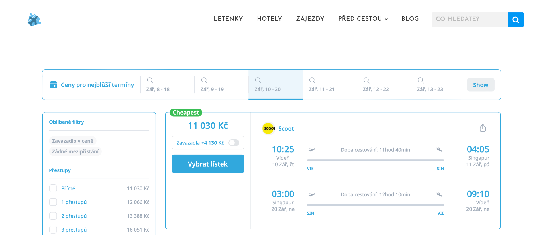 Velká akční příležitost pro milovníky dalekých cest! Zpáteční letenky z Vídně do Singapuru nyní seženete už za 11 030 Kč na řadu termínů v září a říjnu. Navíc jsou dostupné přímé lety bez přestupu, což z cesty dělá pohodlné dobrodružství od prvního okamžiku. K dispozici jsou termíny s odletem i návratem v úterý, čtvrtek, sobotu nebo neděli.