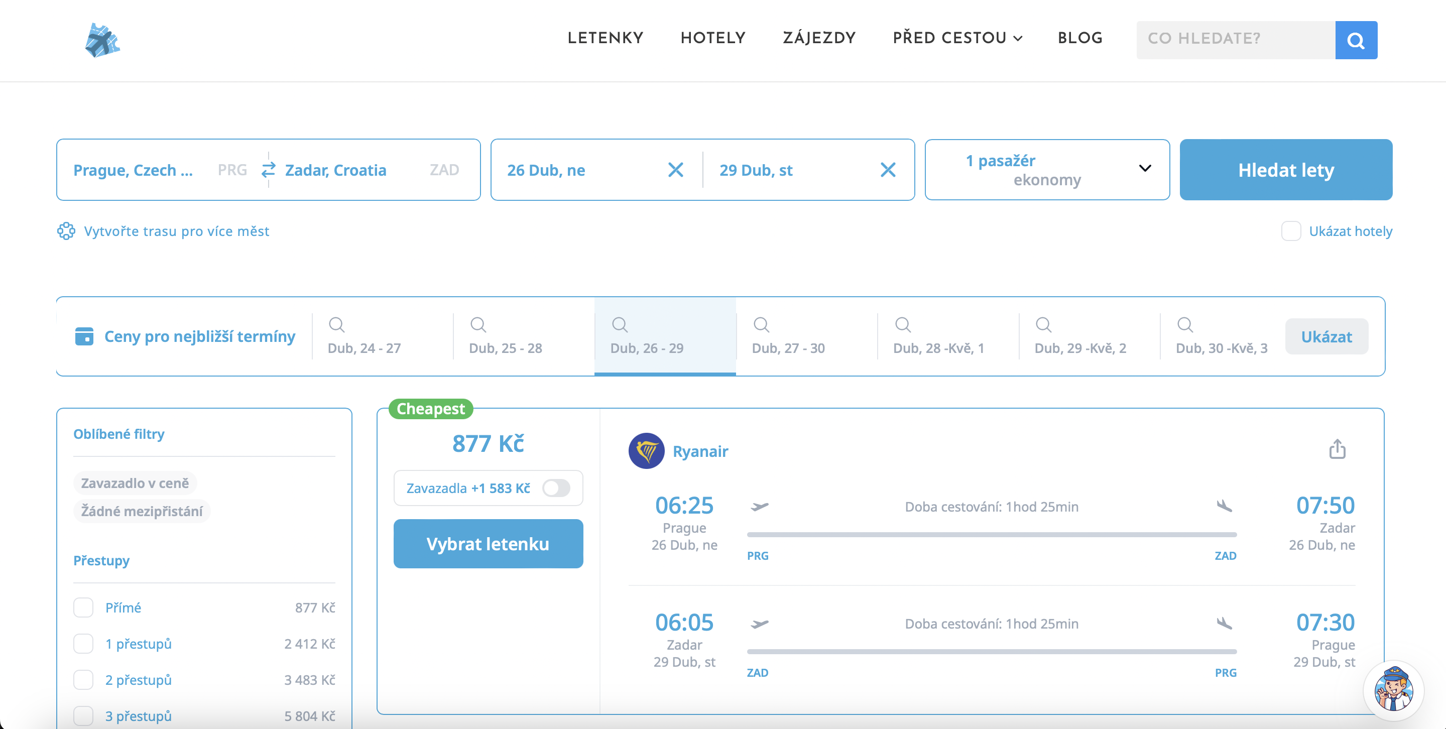 Velmi levné jarní letenky k Jadranu! Zpáteční letenky z Prahy do chorvatského Zadaru pořídíte už za 877 Kč, a to na krátké pobyty v dubnu 2026. Za cenu pod tisíc korun tak můžete vyrazit na několik dní k moři ještě před hlavní sezonou, kdy je v Chorvatsku příjemné počasí, méně turistů a ideální podmínky pro objevování měst i přírody.